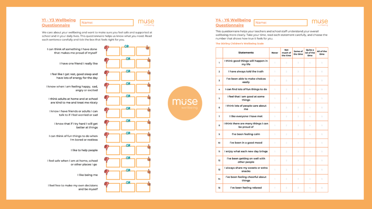 Muse Wellbeing includes two wellbeing questionnaires as part of its curriculum and recommends using them either termly or annually, ideally when pupils enter a new year group or at the start of the academic year. Muse also makes clear that no formal assessment should replace a teacher’s continued understanding of the pupils in their care, and that results from the questionnaires should be used to guide action for individual pupils, groups, or whole classes when necessary.