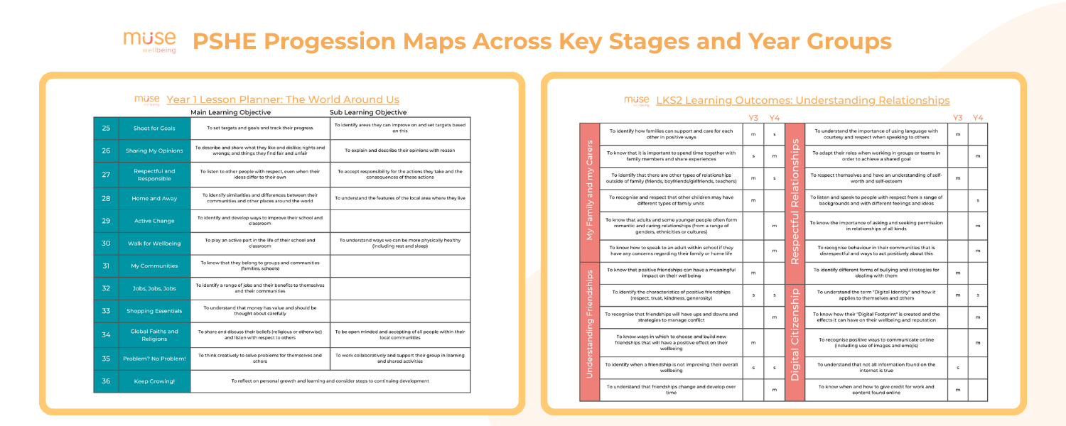 Many PSHE schemes provide a complete PSHE and RSE programme with a fully mapped progression structure from Year 1 to Year 6. An example of how a complete programme connects progression, statutory coverage and teaching resources can be seen at Muse Wellbeing, where progression is clearly mapped from Year 1 to Year 6.